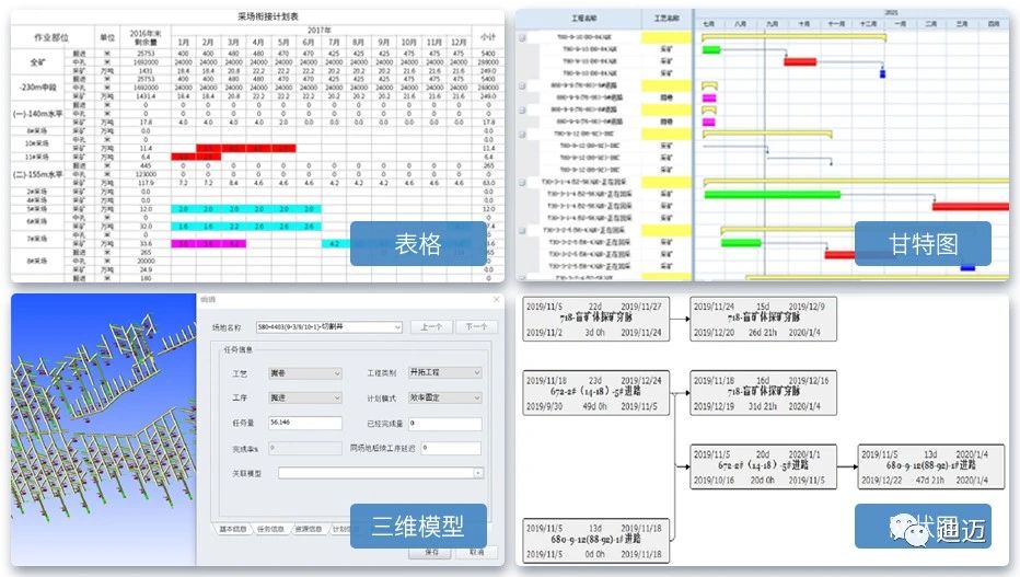 2、研發(fā)“三維模型-甘特圖-網(wǎng)絡(luò)圖-數(shù)據(jù)表”四位聯(lián)動的地下礦采掘計劃編制系統(tǒng),實現(xiàn)排產(chǎn)參數(shù)批處理、計劃聯(lián)動編制和分期采掘圖、自定義報表、進(jìn)度動畫及三維模型等多種計劃成果展現(xiàn)驗證形式。